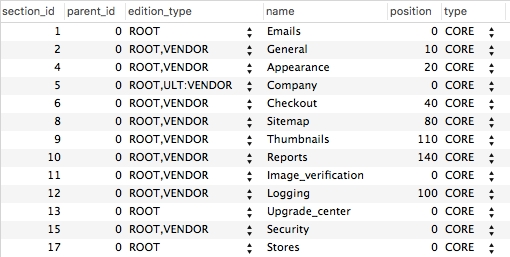 }セクションのリストは、cscart_settings_sectionsテーブルにあります。